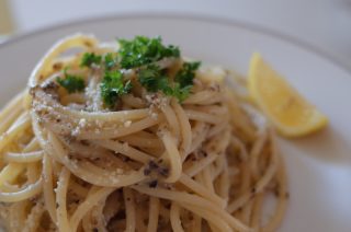- さらにパルメザンチーズを加えて軽く和えてから、皿に持ってパセリ を乗せる。