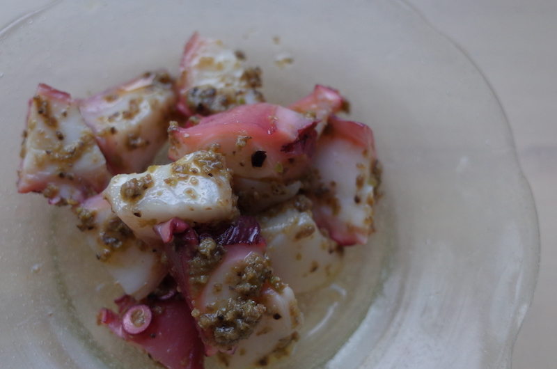 *蒸しダコを一口大にカットしてタプナード と和えます。