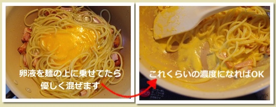 茹で汁を麺になじませます。このひと手間が大切なので、焦らずゆっくり混ぜましょう。 - パスタの上に卵液を乗せ、火をつけてゴムベラを使い優しく混ぜます。卵が固まり始めたら火から外して、濃度をチェックします。フライパンを斜めにして、ゴムベラで卵液をこそぎ、少し遅れて流れてくるくらいなら完成です。