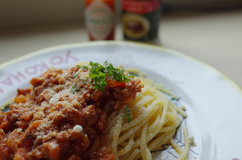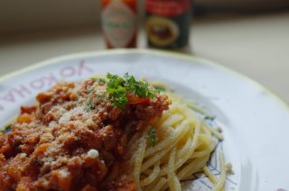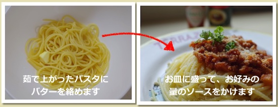 - 茹で上がったパスタにバターを絡めてお皿に盛り、ミートソースをかけます。