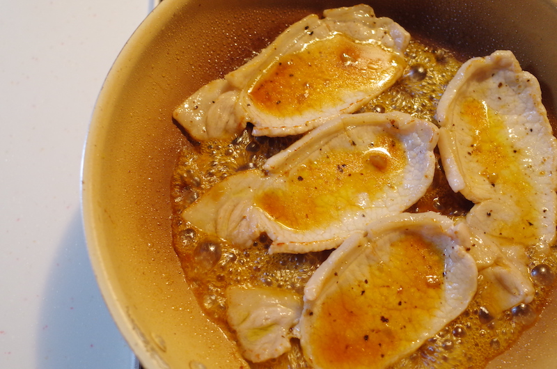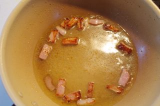 *両面に焼き色がつくくらい炒めたら、油を8割ほど捨てます。 - 炒めたベーコンにパスタの茹で汁(100cc)を加え、火を止めます。ゴムベラでフライパンについた旨味をこそげとりながら混ぜていきます。
