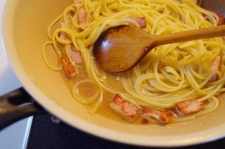 - 茹で上がったパスタを4.のフライパンに入れ、ベーコンの旨味をパスタと合わせていきます。