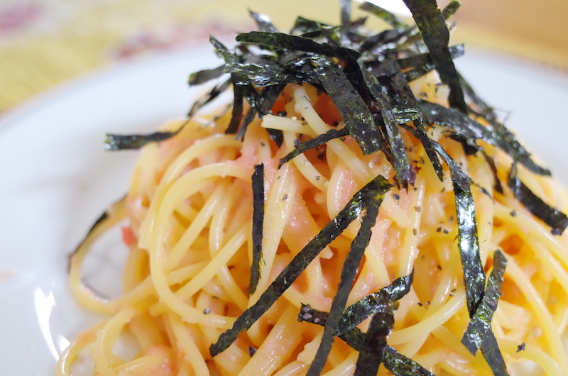 火が入りすぎず、明太子が透明感のあるピンク色での仕上がりを目指します。 - 器に盛り付けたら、お好みでニンニクチップ・黒胡椒・刻んだイタリアンパセリをかけて完成です。*今回は、焼きのりをトッピングしました。