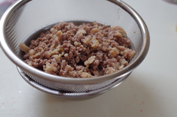 - 合いびき肉に塩少々をふり入れて炒め、ざるにあげて油をきります。