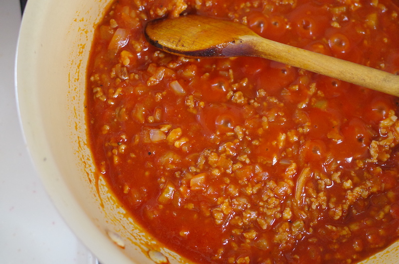 - ざるにあげた合いびき肉、ミートソース缶、ケチャップ、蜂蜜を入れて煮込みます。