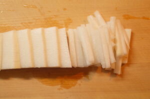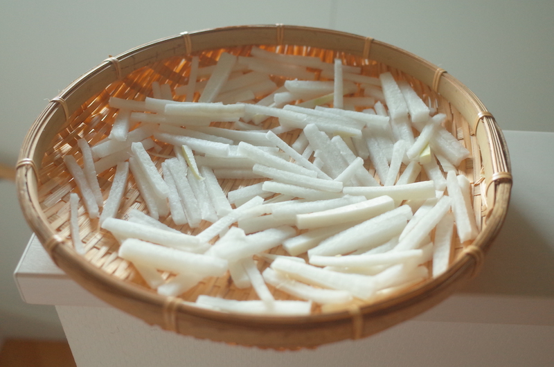 - 大根(1/2本)は繊維に沿って5mm角程度の細切りにする