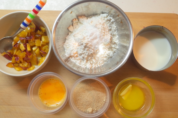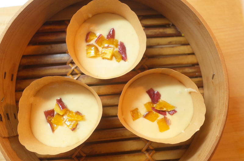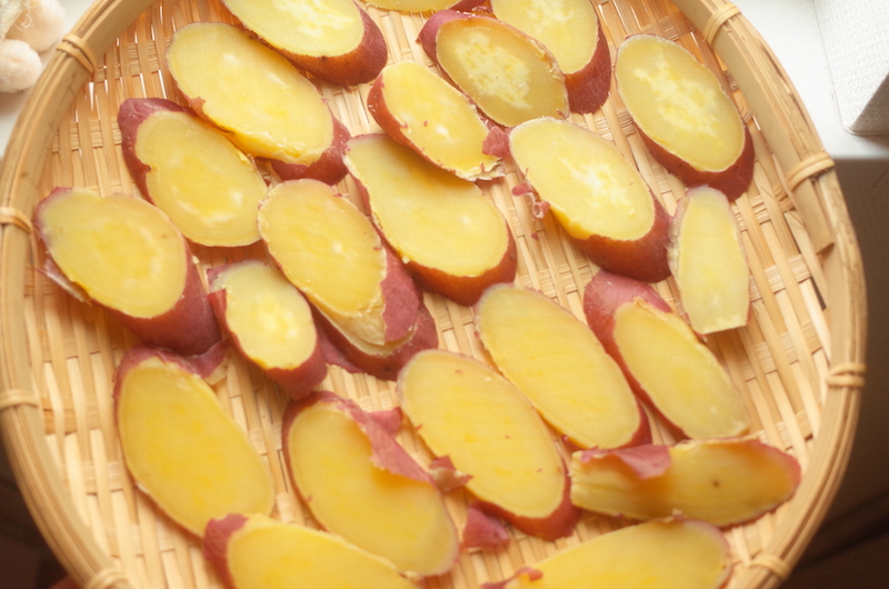 - サツマイモはきれいに洗って、(まるのまま)柔らかくなるまで蒸す。
