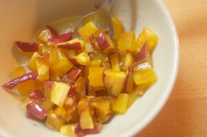 - 耐熱容器に干し芋とバターを入れて、1分くらいレンジで加熱する→干し芋とバターをなじませておく。