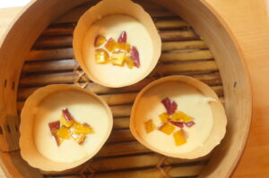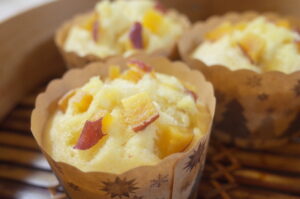 - 蒸気の上がった蒸し器で、強火のまま15分くらい蒸す(竹串を刺して生の生地がついてこなければ出来上がり)。