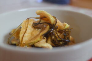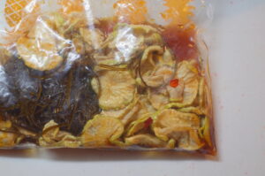 - チャック付きのポリ袋に、調味料(みりん、醤油、酢、蜂蜜、唐辛子)と水を入て、そこに干した大根と刻み昆布を入れて揉む。