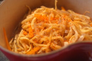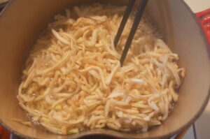 - 1.の切り干し大根は、戻し汁ごと鍋に入れ蓋をして弱中火で10分ほど煮る。