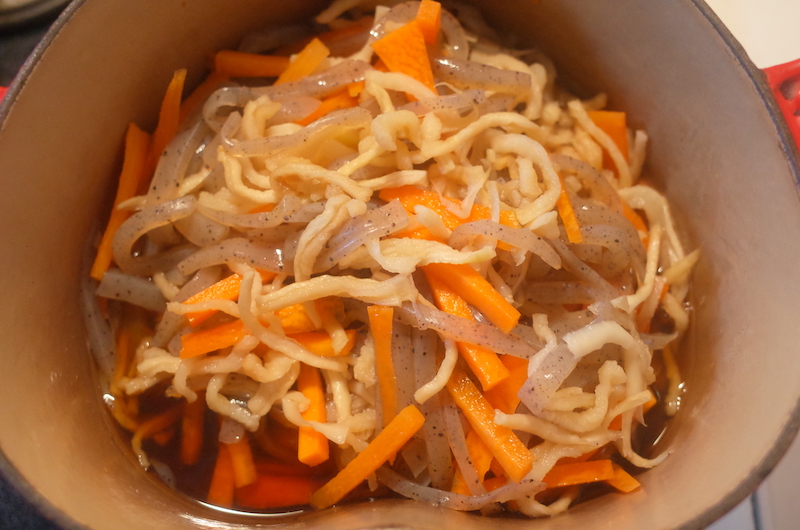 - こんにゃく、人参、調味料(酒、みりん、醤油)を加えて、こんにゃくに味がしみるくらいまでさらに煮る(7〜8分)。