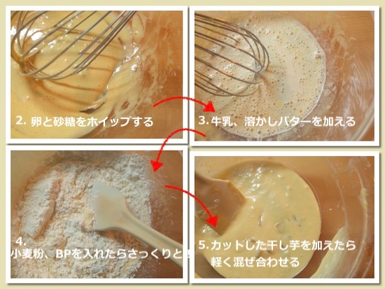 - 干し芋(トッピング用に少し取り分ける)を加えて、ゴムベラで軽く混ぜ合わせる。