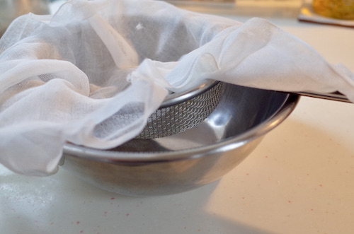*ガーゼ(キッチンペーパーでもOK)を敷いたザルを、ボウルの上にセットしておく。