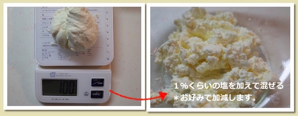 - 出来上がった分量に対して1%の塩を混ぜ合わせてたら出来上がり。