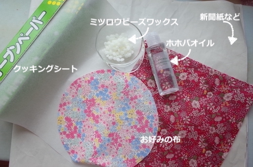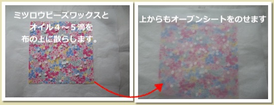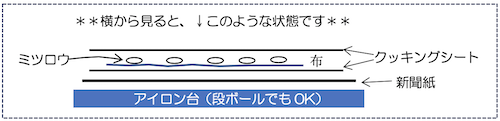 - アイロン台の上に、新聞紙→クッキングシート→布→ミツロウ(ビーズワックス)・オイル→クッキングシート