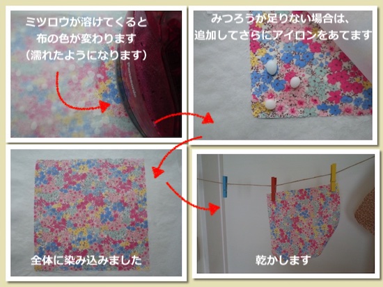 *最初、アイロンは中央付近に置いてミツロウが溶けてきたら徐々に位置を外側に移動させます。 - ミツロウが溶けてくると布の色が変わります。ミツロウが足りないところは追加してさらにアイロンをあてます。