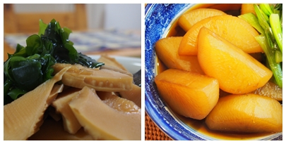八百屋さんの店頭に並び始めたタケノコ。味が染みやすい大根。