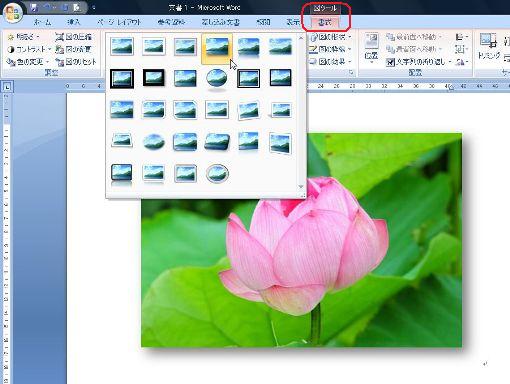 | 1.【挿入】タブをクリックし、【図】をクリックして、【ピクチャ】フォルダから好きな画像(写真)を挿入してください。 2.画像を選択します。ハンドルがつきます。 3.【図ツール】の【書式】タブをクリックすると、【図のスタイル】が表示されますので、好きなスタイルをクリックします。 |