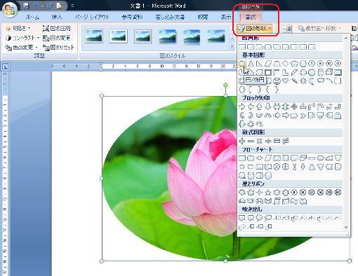 | ワード2003では「ぼかし」などのスタイルを付けることができませんが、図形の中に画像を挿入することができます。 | |