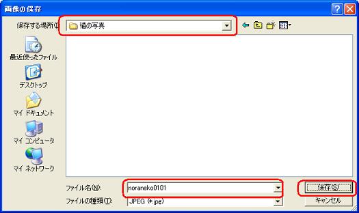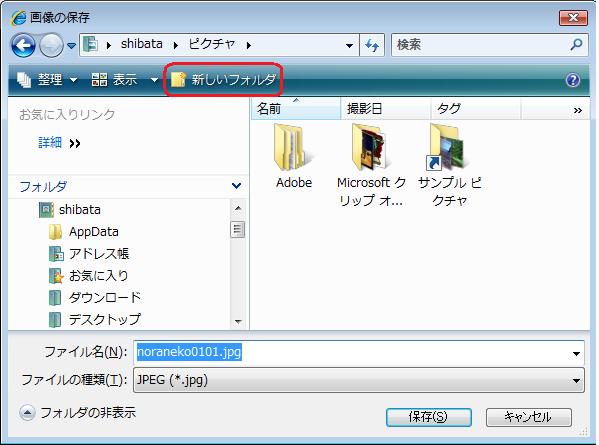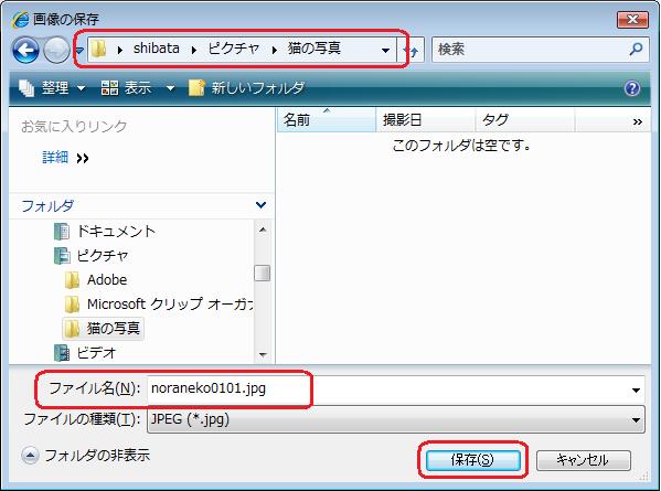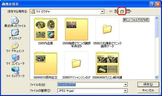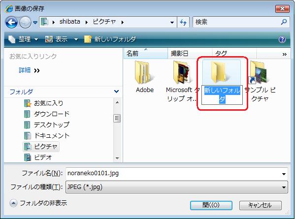 <XP> 9.新しく作ったフォルダに保存します。 ファイル名はこのままで構いません。赤枠を確認しましょう! <Vista> 【Enter】キーを押して確定すると、フォルダが開きます。 <XP> 新しいフォルダに名前を入力した後、【開く】をクリックして、フォルダを開きます。 10.【保存】をクリックします。 必要に応じてフォルダを作成し、ファイルを上手に管理しましょう。 |