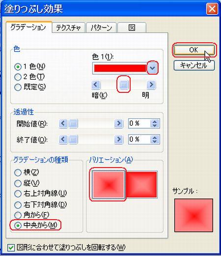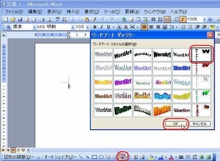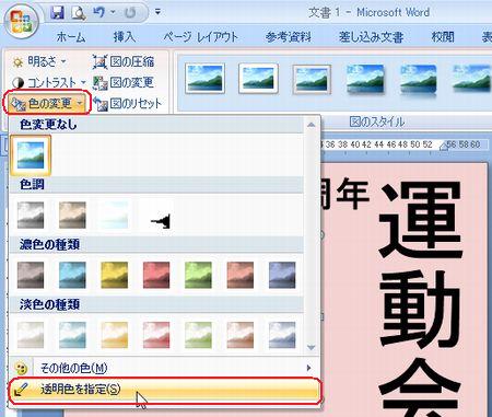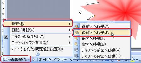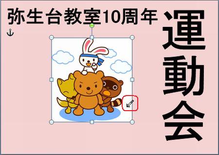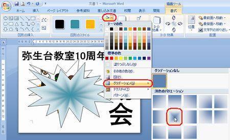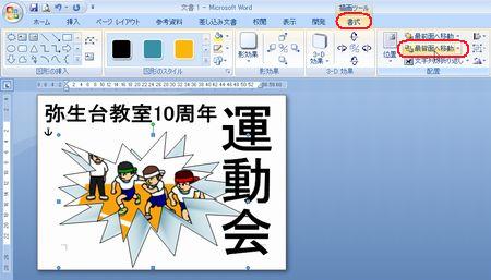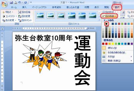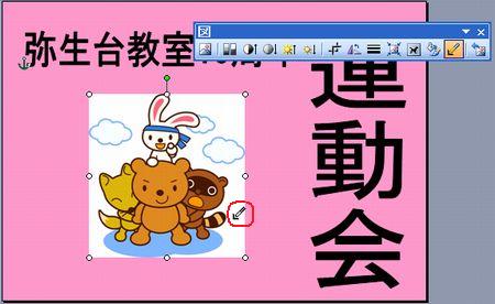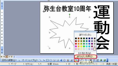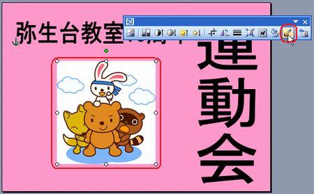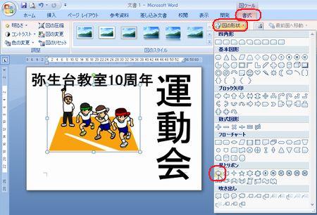 | 運動会のポスターコンテントの出品作品はご覧になっていただけましたか? さまざまなアイデアや工夫が凝らしてあって、実に楽しいです! まだチャレンジしていない方・・ 「こんなにすごいのばっかり並んでいたら、もう出せないわ〜」なんて言わず、ぜひやってみましょう。まだまだ受付中ですよ〜。 そこで、ポスターづくりのアイデアに、ワードの小ネタをご紹介しましょう。 ◆縦書きのワードアート しょっちゅう使っているワードアート。縦書きも使って組み合わせてみましょう。 <<ワード2007>> ![]() <<ワード2003>> ![]() ・・例1・・ ![]() ◆画像を図形で切り抜く イラストや写真を図形で切り抜いてみましょう。 <<ワード2007>> 1.あらかじめ用意した図を挿入し、大きさを整えます。 2.図ツールの【書式】タブから【図の形状】の【▼】をクリックし、好みの図形を選択します。 ![]() 3.【図の枠線】の【▼】をクリックし、好みの色を選択します。 ![]() 4.【文字列の折り返し】の【▼】をクリックし、【前面】にして、好きな場所に移動します。 <<ワード2003>> 1.図形描画ツールバーの【オートシェイプ】から好きな図形を描きます。 2.図形描画ツールバーの【塗りつぶしの色】の【▼】をクリックし、【塗りつぶし効果】をクリックします。 ![]() 3.【図】タブをクリックし、【図の選択】をクリックします。 ![]() 4.あらかじめ用意した図を選択し、【挿入】をクリックし、【OK】をクリックします。 ・・例2・・ ![]() ※このイラストは郵便局のフリーイラスト集より選びました。 ↓ ↓ http://www.jp-network.japanpost.jp/amusement/downloads/ ◆図形を重ねて、順番を入れ替える ちょっとインパクトが足りないなあ〜と思ったので、図形を重ねてみました。 <<ワード2007>> 1.【挿入】タブの【図形】をクリックし、同じ図形をやや大きめに描きます。 2.【図形の塗りつぶし】の【▼】をクリックし、【グラデーション】から好みのパターンをクリックします。 ![]() 3.【最背面へ移動】をクリックします。 ![]() 4.【図形の枠線】で、【線なし】をクリックします。 <<ワード2003>> 1.図形描画ツールバーの【オートシェイプ】から同じ図形をやや大きめに描きます。 2.図形描画ツールバーの【塗りつぶしの色】の【▼】をクリックし、【塗りつぶし効果】をクリックします。 3.好きな【グラデーション】の色とパターンを設定し、【OK】をクリックします。 ![]() 4.図形描画ツールバーの【線の色】の【▼】をクリックし、【線なし】をクリックします。 5.図形描画ツールバーの【図形の調整】をクリックし、【順序】から【最背面へ移動】をクリックします。 ![]() ・・例3・・ ![]() ◆イラストの背景を透明色にする 背景に色を付けてイラストを挿入したら、白くくり抜かれてしまった時は、透明色を指定してみましょう。 こういう場合です。 ↓ ![]() <<ワード2007>> 1.図ツールの【書式】タブから、【色の変更】の【▼】をクリックし、【透明色を指定】をクリックします。 ![]() 2.透明にしたい色の上でクリックします。 ![]() <<ワード2003>> 1.図ツールバーの【透明色に設定】をクリックします。 ![]() 2.透明にしたい色の上でクリックします。 ![]() ・・例4・・ ![]() いろいろなアイデアでワードを楽しみましょう! 実際の操作でわからないことがありましたら、どうぞおたずねください。 いつでも、何回でもやさしく笑顔でお答えしま〜す★⌒(@^-゜@)v ♪ |