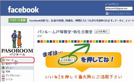 | 「facebookって何?」を開催させていただきました。 報告ページはこちらからご覧ください。 教室のfacebookページは教室のホームページの左下の画像をクリックします。 次に【ウォール】をクリックします。 【いいね!】をクリックするには、ユーザー登録が必要になります。 ユーザー登録については、次号でご紹介しますね。 ユーザー登録をしていなくても、ウォールの記事を閲覧することはできますので、新しいインターネットの世界を覗いてみてください。 ☆⌒(*^-゜)ノ~♪see you again♪~ヾ(゜-^*)⌒☆ (柴田) |