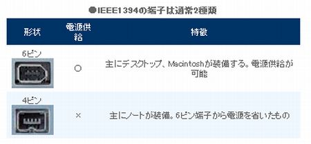 「アイトリプルイーいちさんきゅうよんたんし」と読みます。![]() IEEE1394ケーブルをつなぐための接続口です。または、そこに差し込むケーブルの先端のことをいいます。 主に、ビデオカメラやドライブなどの周辺機器と接続します。 IEEE1394の端子には、6ピンと4ピンの2種類があります。 一般的には、ノートパソコンでは4ピン、デスクトップパソコンでは6ピンが採用されることが多いようです。また、デジタルビデオカメラなどの映像機器や家庭用機器では4ピンを採用している例が多く見かけられます。 2つの違いは、接続した機器にケーブル経由で電力を供給できるかどうかです。6ピンの端子はデータを流すための信号線が4本と、電力を供給するための電力線が2本という構成になっています。 4ピンの端子は4本の信号線だけで構成されています。そのため、4ピンの端子の場合はAC電源やバッテリーのような外部電源が必要になります。 メーカーによっては、「iLink(アイリンク)端子」「DV(ディーブイ)端子」「FireWire(ファイアワイア)」ともいいますが、同じ規格です。 |