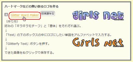 | 前号でロゴを作れる「ロゴジェネレーター」をご紹介したところ、中には英語のサイトに飛んで行ってよくわからない、というお声がありましたので、わかりやすいサイトを選んでご紹介します。 今回ご紹介するロゴは、キラキラ動きます。 ピクチャフォルダーの中では、動きがわかりませんが、メールに添付すると動いているのがわかります。 キラキラ動くロゴをメールに付けてお友達に送ってみましょう!(^^ゞ ご紹介するものは、全て無料ツールなので,お気軽にお試しくださいね。(^^)/ まずは、以下のサイトにアクセスしてみてください。 ◆ロゴジェネレーター http://girlsnet.ninpou.jp/logo.html 1.画面を下にスクロールし、【Glitter Word Maker】をクリックします。 2.一覧から好きなパターン、フォントをクリックで選択し、作成したい文字をアルファベットで入力します。【Glitterfy Text】をクリックします。 3.文字が作成されます。 4.文字の上で右クリックし、【名前を付けて画像を保存】をクリックします。 5.(マイ)ピクチャフォルダを選択し、【保存】をクリックします。 6.他のパターンでも作成してみましょう。 7.【スタート】をクリックし、【(マイ)ピクチャ】をクリックして保存した画像を確認しましょう。 保存した画像は、ワードやエクセル、ジャストホームなどに貼り付けて使うことができます。 また、Outlool ExpressやWindowsメールに挿入すると、キラキラ動く画像として送ることができます(Gメール、Windows Liveメールでは、画像を添付送信できますが動きません。ご了承ください) <Windowsメールで画像を挿入する方法> 1.Windowsメールを起動します。 2.メニューの【挿入】をクリックし、【画像】をクリックします。 3.【(マイ)ピクチャ】から挿入したい画像を選択し、【開く】をクリックします。 4.文面に挿入されたことを確認します。宛先や件名、本文などを入力して送信してください。 質問、わからないこと、何でもおたずねください。 いつでも、何回でもやさしく笑顔でお答えしま〜す★⌒(@^-゜@)v ♪ |