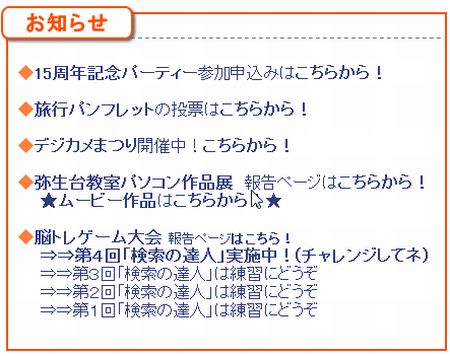 | こんにちは。 11月になりましたが、日中は蒸し暑い日があったりして季節感がピンときません。 寒暖の差で風邪を引きやすくなっていますので、どうぞお気を付けください。 教室のホームページは今、文化祭のような賑わいです。 トップページの【お知らせ】をご覧ください。 まず、上から ◎パソルーム15周年記念パーティーの詳細が決まり、参加申し込みが始まりました。 ⇒こちらからどうぞ ◎旅行のパンフレットの投票が始まりました。 作品は各教室で印刷されたものをご覧ください。 ⇒こちらからどうぞ ◎デジカメまつりが始まりました。 ぜひ、投票してね!作者の生の声を聞くことができます。 ⇒こちらからどうぞ ◎弥生台作品展の報告とムービー作品をご覧ください。 すごくいいです!!毎日少しずつお楽しみください。 ⇒こちからどうぞ ◎検索の達人!第5回目となりました。 ⇒こちらからどうぞ 一度に全部見ようと思うと大変です。 毎日少しずつお楽しみいただけたら、うれしいです!(*^_^*) 11月号の「あ〜り〜ば〜ど Vol.153」も発行されました。