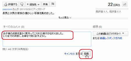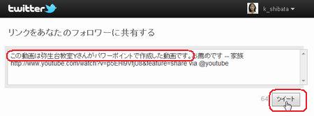 | 10/25〜10/31まで弥生台教室の作品展がいつもの緑園都市駅構内ギャラリーで開催されました。 素晴らしい作品を出品していただいた生徒さん、ご来場いただきました多くの皆様に心よりお礼申し上げます。ありがとうございます。 今年は作品が少ない?って感じられました? いえいえ、そんなことはなくて、パワーポイントやムービーメーカーで作成した動画がたくさん出品されていたのです。 その内容の素晴らしいこと! 作品展だけでしか見ることができないのではもったいないですね。 というわけで、どのパソコンでも、スマートフォンでも、iPadでも、見ることができるYoutube(ユーチューブ)にアップしましたので、ぜひご覧になってください。 1.教室ホームページ(www.pasoroom.jp)の【お知らせ】から、【★ムービー作品はこちらから!★】をクリックします。 2.最初の作品から見てみましょう。「タイトル」をクリックします。 3.Youtubeで作品が再生されます。【全画面】をクリックすると、画面いっぱいの大きさになります。 4.動画が終了したら、キーボードの【Esc】キーを押します。 5.【戻る】をクリックして、ムービープログラムのページに戻ります。 6.次の作品のタイトルをクリックして、同じように見ていきましょう。 ここまでは、ただ「見る」だけです。 この先は、Gmailのアカウントでログインしてみましょう! 7.画面右上の【ログイン】をクリックします。 8.Gmailのアドレスとパスワードを入力して、ログインします。 9.コメント欄にコメントを入れられます。 さらに、Twitterやfacebookのアカウントを持っていると・・ 10.【評価する】をクリックして、【Twitter】をクリックします。 11.【Twitter】にログインします。 12.メッセージの部分を書き換えて、【ツイート】をクリックします。 Youtubeもただ見ているだけでなく、感想を書いたり、Twitterでつぶやいたりできるのです。 Gmailのアカウントをまだ持っていない方は、ぜひ取得しましょう。 楽しみが広がりますよ!(^_-)-☆ 質問、わからないこと、何でもおたずねください。 いつでも、何回でもやさしく笑顔でお答えしま〜す★⌒(@^-゜@)v ♪ |