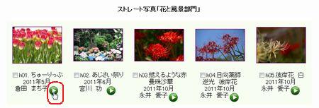 | デジカメまつりに作品が揃いました! ご覧ください!どうですか?うっとりしますね! 素敵な写真、楽しい写真、あれもこれもいいなあと思う写真ばかりです。 今年は「デジカメコンテスト」を「デジカメまつり」として、写真加工の部門も設けました。 こちらもいいですね。 このままポストカードにしたり、カレンダーや年賀状に使えそうです! ご覧になるときには、ビデオメッセージも聞いてくださいね。 再生ボタンをクリックすると、メディアプレーヤーが起動します。 WindowsXPやVistaの方で、最初はなかなか再生されない方もいらっしゃるかもしれませんが、少しお待ちいただければ再生されると思います。 どうぞ最後までゆっくりご覧になって、いいなと思うものにそれぞれの部門から2点ずつ選んでください。 また、メッセージも寄せていただけると嬉しいです。 今回は、チューター作品も掲載しました。これはおまけです。(^^ゞ |