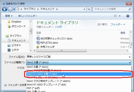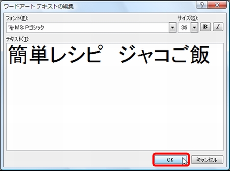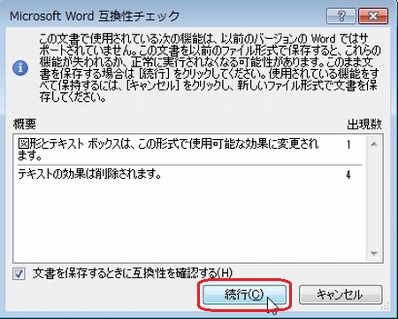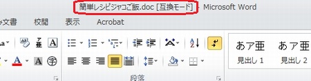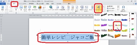 | 今回の話題は、ワードです。 それもワード2010をお使いの方向けです!(ワード2007、2003の方は<m(__)m>) でも、知っておいて損はないお話なので、ワード2010以外の方も、ぜひ最後まで目を通してみてくださいね。(^^) ワード2010をお使いの方が、ワード2007のテキストで書かれていると、ワードアートが全然違うなあとお感じになられていることと思います。 まず、ワード2007と2010のワードアートの違いをご紹介しましょう。 ここでは、1行目に「簡単レシピ ジャコご飯」というワードアートを挿入する例を紹介します。 ◆ワードアートの挿入(Word2007の場合) 1.【挿入】タブをクリックし、【ワードアート】をクリックします。 2.上から3番目、左から4番目のスタイルをクリックします。 3.「簡単レシピ ジャコご飯」と入力します。 4.【OK】をクリックします。 ◆ワードアートの挿入(Word2010の場合) Word2010では、ワードアートを挿入するための幅の分だけ、あらかじめ改行しておきます。そして挿入位置にカーソルを戻して挿入します。 ここでは、4行改行してから1行目にワードアートを挿入します。 1.1行目にカーソルがある状態で、【Enter】キーを4回押して改行します。 2.1行目にカーソルを戻します。 3.【挿入】タブをクリックし、【ワードアート】をクリックします。 4.上から3番目、左から4番目のスタイルをクリックします。 5.「簡単レシピ ジャコご飯」と入力します。 ワード2010のワードアートは、ハンドルをドラッグすることで大きさを調整できず、ポイント数で大きさを調整します。 さて、ここで・・・・ ワードアートがずいぶんと違うのに気が付かれましたね。ワード2003、2007で馴染んできたワードアートを使いたい!と思う方も多いことでしょう。 ここから、今日の本題です。 ◆ワード文書の保存の際に【Word97-2003形式】を選ぶ ワード2010で作成したファイルを【Word97-2003形式】で保存します。 1.【ファイル】タブをクリックし、【名前を付けて保存】をクリックします。 2.ファイル名を入力します。 【ファイルの種類】の【▼】をクリックし、【Word97-2003形式】をクリックします。 3.【保存】をクリックします。 4.【互換性チェック】のウィンドウが出てきた場合は、【続行】をクリックします。 5.ワードを終了します。 ◆【Word97-2003形式】で保存したファイルを開く 1.先ほど保存したファイルをダブルクリックします。ワードが起動し、ファイルが開きます。 2.テキストボックス化した文字をドラッグし、【挿入】タブの【ワードアート】をクリックします。 ワード2007でのワードアートが表示されます!好きなデザインを選びましょう!! 3.【OK】をクリックします。 4.ワードアートが挿入されます。 以前の形式(Word97-2003形式)のファイルをワード2010で開くと、【互換モード】になります。互換モードの場合、タイトルバーに表示されます。 質問、わからないこと、何でもおたずねください。 いつでも、何回でもやさしく笑顔でお答えしま〜す★⌒(@^-゜@)v ♪ |
