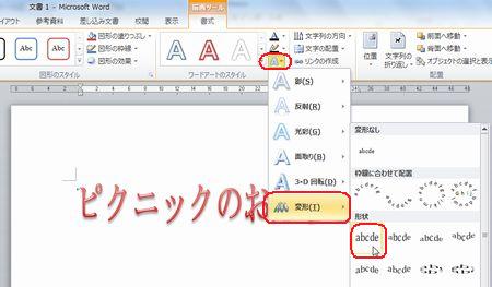 | Word2010のワードアートがすっかり変わっちゃって・・という方の中には、ドラッグで自由に大きさを変えられなくなってしまったことに不自由さを感じる方も多いことでしょう。 そうです。 Word2010では、ワードアートで作った文字の大きさはポイント数でしか変えられず、縦や横にびよ~んと伸ばすことができません。 でも、実はやり方があるんです! 今回は、その方法をご紹介します。 1.Word2010を起動します。 2.【挿入】タブをクリックし、【ワードアート】をクリックします。 3.好きなサンプルを選択します。 4.「ピクニックのお知らせ」と入力します。 5.点線の枠をクリックします。 6.【文字の効果】の【変形】をクリックし、【形状】から一番左上のサンプルをクリックします。 7.ハンドルをドラッグすると、自由に大きさが変えられます。 さあ、これで自由自在! もちろん、好きな形の変形を選んでもOKです。 質問、わからないこと、何でもおたずねください。 いつでも、何回でもやさしく笑顔でお答えしま~す★⌒(@^-゜@)v ♪ |
