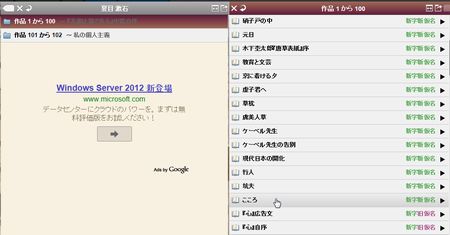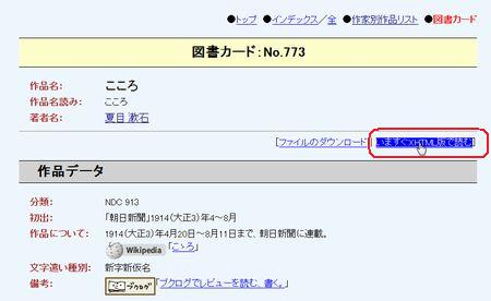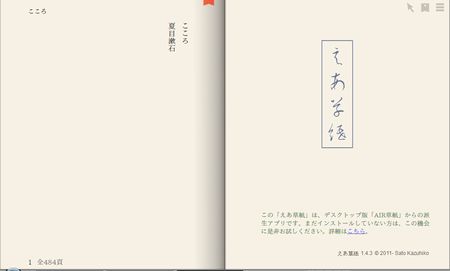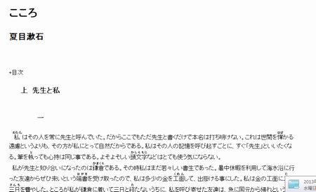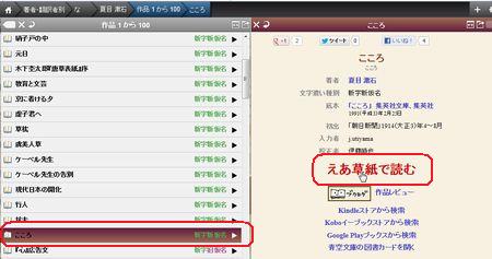 | インターネットの巨大本屋さん「アマゾン」。 今やその販売品目は家電や食品などにも拡がり、安さ、商品の届く早さで、いつも便利に使っています。 このアマゾンが、Kindle(キンドル)という書籍専門のデジタル端末を発売し、それに伴ってKindle版という電子書籍がアマゾンで販売されるようになりました。 (すべての本に電子版があるわけではありません。) これを読むのには、もちろんこのKindleがあれば何も問題はないのですが、iPadなどのタブレット端末やスマホをお持ちの方は、Kindleアプリ(無料)を入れれば利用できるので、わざわざ購入する必要はありません。 このやり方については、簡単ではありますが自分のブログ「Sのブログ」でご紹介させていただきました。 最近は、これで読書をするのが手軽で便利で、すっかり自分のスタイルに定着しています。みんなに紹介したくてしょうがないのですが、タブレットやスマホをお持ちでない方も多いですよね。そこで、パソコンで同じことができないのか探してみたら、ありました! ・・・と、ここまではいいのですが、これが日本のアマゾンでは使えないのです。 アメリカのアマゾンでアカウントを取得して・・となると英語だらけ。。。 これではねえ。。。残念!!(>_<) というわけで、青空文庫をご紹介します。 青空文庫とは、日本国内において著作権が消滅した文学作品、あるいは著作権者が許諾した文学作品を収集・公開しているインターネット上の電子図書館のことです。 「本を電子化して、誰でも読めるようにしておくと面白い」。そう考える人達が集まって、青空文庫は生まれました。 ◆青空文庫 http://www.aozora.gr.jp/ 1.上のリンクをクリックして、青空文庫のサイトにアクセスしてみましょう。 2.読みたい本の作家名をクリックしてみましょう。 ※ここでは夏目漱石の「こころ」を読もうとしています。 3.画面をスクロースして、【夏目漱石】をクリックします。 4.公開中の作品一覧の中から、【こころ】をクリックします。 5.図書カードが表示されます。【いますぐXHTML版で読む】をクリックします。 6.「こころ」が表示されましたね!これでひたすらスクロールしながら読んでいきます。 これでは横書きで、とても読みづらい・・という方・・ 縦書きで本のように読める方法はないの?・・という方・・ 以下のリンクをクリックしてみましょう。 ◆えあ草紙 http://www.satokazzz.com/books/ 1.「えあ草紙・青空図書館 | 青空文庫専用図書館」のサイトにアクセスします。 2.【著者・翻訳者別】をクリックし、【な】をクリックします。 3.【夏目漱石】をクリックします。 4.【作品1から100】をクリックして、【こころ】をクリックします。 5.【えあ草紙で読む】をクリックします。 6.本のような感じで表示されましたね。左側のページをクリックすると、次ページが表示されます。 7.読みかけの状態で終了するときには、栞をマークしておきましょう。 右上の【栞を現在位置に移動する】をクリックします。オレンジ色の栞が表示されます。 8.インターネットを終了し、同じように「こころ」を開くと、栞をはさんだところから読むことができます。【お気に入り】に追加しておけば、簡単にページを開くことができます。 パソコンの画面で本を読むのは、とても目が疲れます。どうぞ、休み休みのんびりと読書を楽しんでくださいね。(^^) わからない点は、教室でチューターまでおたずね下さい! いつでも何回聞いても笑顔をお答えしま〜す!!!ヽ(^o^)丿 |