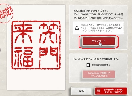 | 年賀状の準備がそろそろ気になる季節になりました。 今年はどんなデザインにしようかなあと考え中の方もいらっしゃることでしょう。 インターネット上で簡単に手作り風のはんこを作れるサイトを見つけました。 文字をはんこにするだけでなく、顔写真もはんこにできるのです。 可愛いお孫さんの写真、ペットの写真ではんこを作るのも楽しいですね。 では、早速チャレンジしてみましょう! 1.郵便局の「手作り風はんこ作成ツール」のサイトを開きます。 ⇒http://yubin-nenga.jp/hanko/ 2.【はんこを作る】をクリックします。 3.【テキストをはんこにする】をクリックします。 4.好きなはんこのデザイン、色を選び、文字を入力して、【次へ】をクリックします。 5.必要に応じて調整をして、【完成/次へ】をクリックします。 6.完成です。【ダウンロード】をクリックします。 7.ピクチャフォルダーに名前を付けて保存します。 8.ピクチャフォルダーを開いて確認してみましょう。保存したファイルを見つけられましたか? あとは年賀状に貼り付けたり、カレンダーに貼り付けたり、好きに使ってみてくださいね。(^^) 顔写真でも作ってみました!誰の顔だかわかりますか? わからない点はおたずね下さい! いつでも何回聞いても笑顔をお答えしま~す!!!ヽ(^o^)丿 |