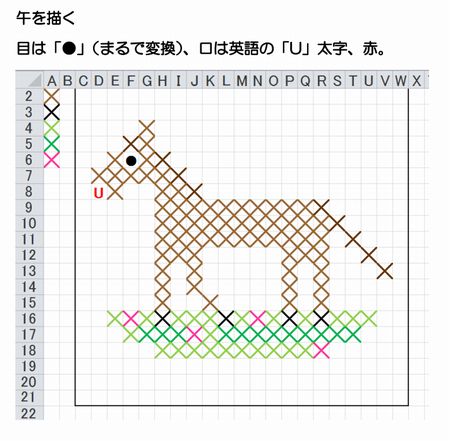| *。o○☆*(。´・▽・`。)_¨_*☆○o。*_¨__・*(。´・▽・`。)¨_*☆○o。* この画像、なんだかわかりますか? 見たことあるようなマス目ですね。 そう、エクセルのセルに「×」を入力して作る、クロスステッチです。 来年の干支の馬をデザインしています。 なんだか作ってみたくなりませんか??ぜひぜひやってみてくださいね。 お年玉袋や箸袋などのワンポイントにどうぞ! 一年があっという間に過ぎていきました。 振り返ってみて・・今年は「整える」ということをひとつ目標に掲げていたことを思い出し、何がどこまで整ったんだろう?と反省モードですが、今年も無事過ごさせてもらったことに感謝しつつ、一日一日を丁寧に過ごしたいと思います。 ☆⌒(*^-゜)ノ~♪see you again♪~ヾ(゜-^*)⌒☆ (柴田) |