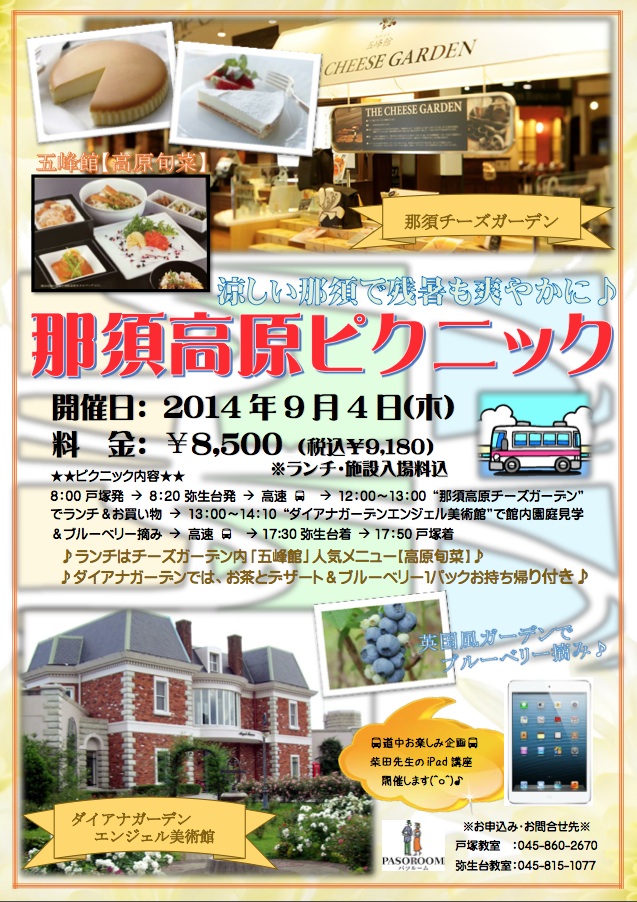 ◆那須高原バスピクニックのお知らせ♪![]() お待たせしました!9月4日にパスピクニックを開催します(^O^)/ おいしい食事と、チーズガーデンでのショッピング、英国風ガーデンを見学して、ブルーベリー摘み。バスの中ではiPad特別講座も予定しています。 ぜひ皆さま、ご参加ください。 開催日 9月4日(木) 参加費 ¥8,500(ランチ代・施設入場料込) お申し込みはこちらから↓ 那須高原バスピクニック申込み ◆パソコープ動画発表会で、弥生台教室の山崎さんが受賞! 5月から募集がありました「第4回パソコープ動画作品発表会」。 弥生台教室の山崎且義さんが、iPad部門で1位、パソコン部門で2位を受賞されました! おめでとうございます! iPad部門の『春を求めて』は、春の花々と風景を映した美しい作品。 パソコン部門の『私はトイプードルのアミです』は、愛犬アミの成長を見ることができるかわいらしい作品。 どちらも山崎さんのナレーションが活きています。 パソコープの発表ページからどうぞご覧ください。 http://pasocoop.org/kyoukai/30/35/4_1.html 弥生台教室での表彰の様子と、山崎さんのコメントはこちらからご覧ください。 http://blog.goo.ne.jp/pasoroom/e/454b6b19a31a3c0eb8a8f868e90d3c74 ◆よっちゃんのキッチン更新! 今月のよっちゃんのキッチンは、 「蒸し大豆」で丸ごと大豆を食べちゃいましょう! 大豆はからだにとてもいい食品です。 たくさんのレシピをご紹介していますので、ぜひご覧くださいね! ◆お知り合いをパソルームにご紹介ください パソルームの生徒の方、卒業生の方のご紹介で入会していただいた方は、入会金が1,000円引きとなります(同一世帯のご家族は2,000円引き) 紹介した方にも500円分のクオカードをプレゼント! ぜひ、ご家族・ご友人・お知り合いにパソルームをお勧めください(^O^)/ ◆個人レッスンの価格帯が増えました マンツーマン指導の個人レッスン。今までは、 一般 1時間:4,000円 パソルーム倶楽部価格 1時間3,000円 でしたが、これに、 一般(入会金なし) 1時間5,000円 の価格帯が増えました。 数時間だけで問題が解決する、ここだけで教えて欲しい。そのような方がいらっしゃいましたら、ぜひこちらをご検討ください(もしくはお知り合いにお勧めください)。 |