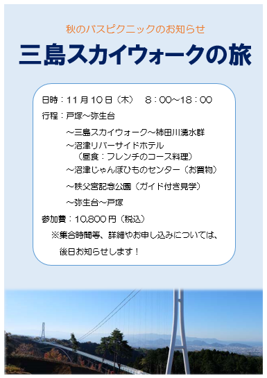 「三島スカイウォークの旅」秋のピクニックの申込開始です!
