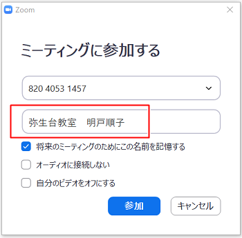 Zoom入室時、表示名を「弥生台教室 明戸順子」のように、どなたかわかるお名前にしてご入室ください。入室後でも変更できます。ご不明な場合はお声かけください。