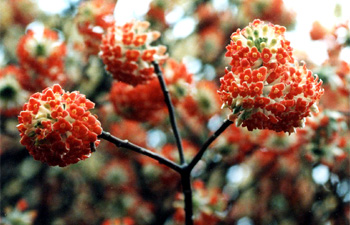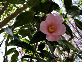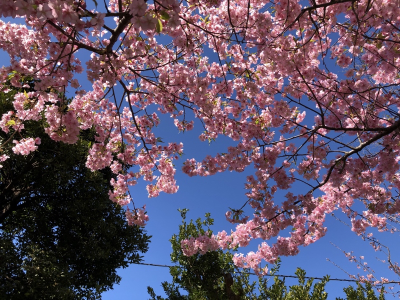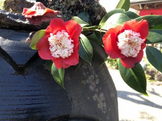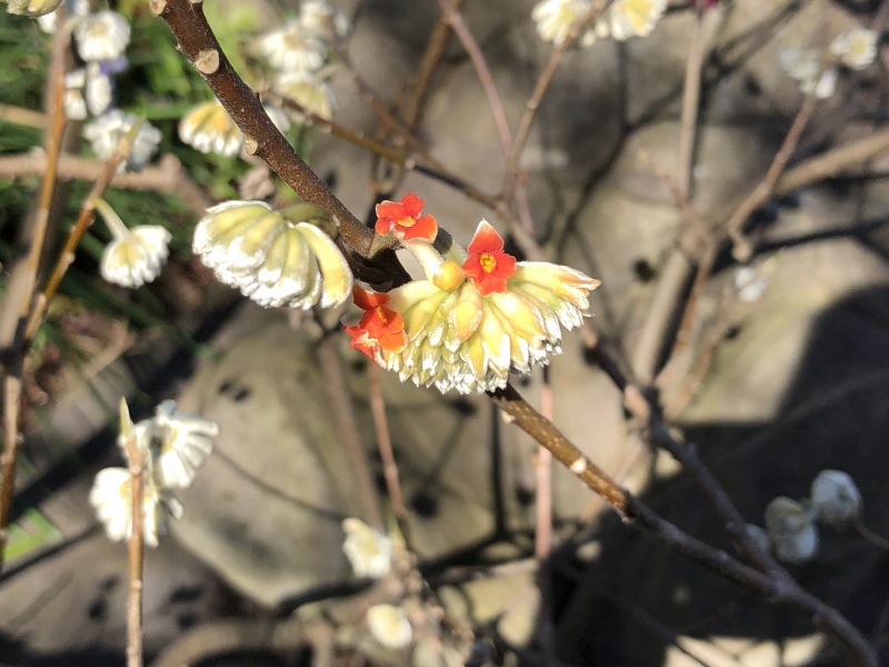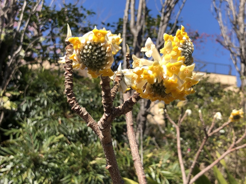 この常泉寺は「花のお寺」として有名ですね。まだ2月ということでお目当ての「三椏」はこの時期は原種の黄瑞香(きずいこう)でしたが、3月になるとオレンジや黄色の三椏の花で満開になるようです。また今はしだれ梅や沖縄桜が満開でした。(写真の上でクリックすると大きな画像になります)
