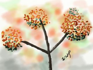 今回は「三椏の花を描く」がテーマで、お道具はクレヨン・エアブラシを使います。下絵は描かず直接色付けから始まります。