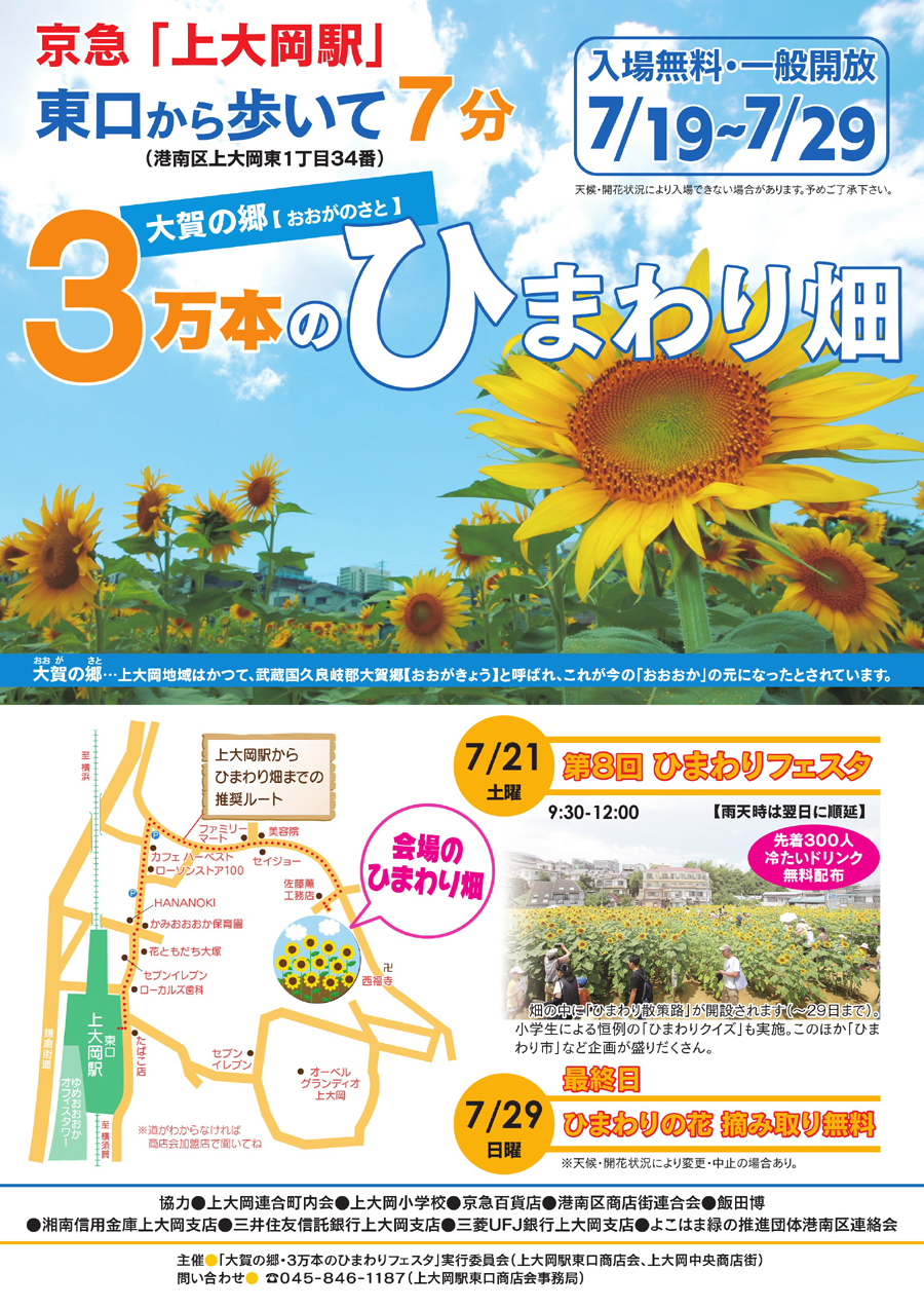 京急上大岡中央改札より右手にエスカレーターを登って東口商店街を徒歩8分くらいに「ひまわりフェスタ」となる会場が見えてきます。