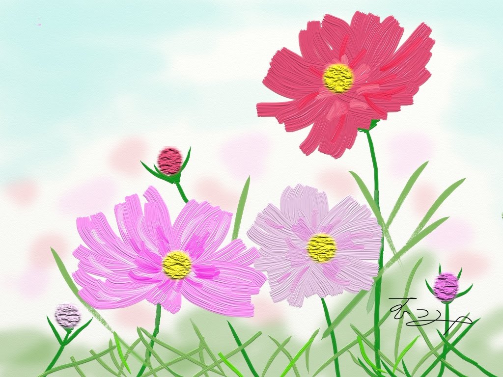 9月のスケッチピクニックはちょっと足をのばし横浜から離れ「浜離宮恩賜庭園」でコスモスを描きます。今回もお道具に油筆とエアブラシを使ってイラスト風に仕上げます。