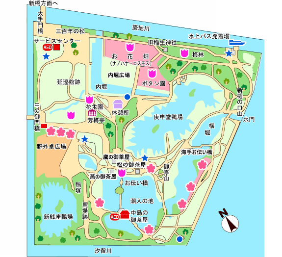 また「潮入の池」「お伝い橋と中島の御茶屋」「松の御茶屋、燕の御茶屋、鷹の御茶屋」「三百年の松」と江戸時代の代表的な大名庭園です。