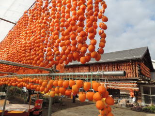 岩波農園で干し柿に使うのは「甲州百匁柿」という大きな渋柿で、皮を向いた柿を吊るして天日干しにします。20間ほど干した後、更にすのこの上で平干しし、完成まで1ヶ月はかかります。戦国時代にこの地を治めていた武田信玄は干し柿作りを奨励し、増産を図ったようです。完成した干し柿は「ころ柿」と呼ばれ、贈答品として人気です。