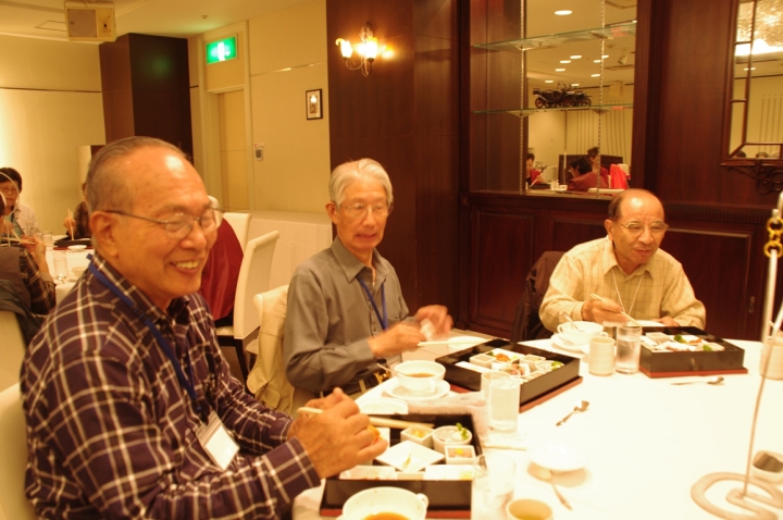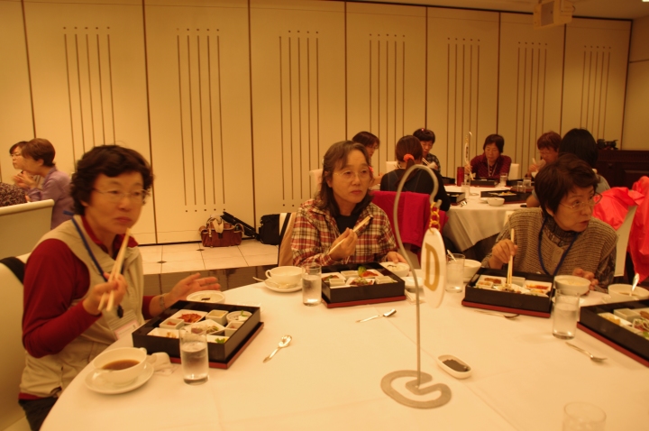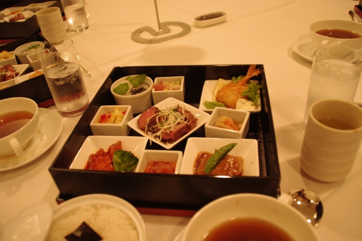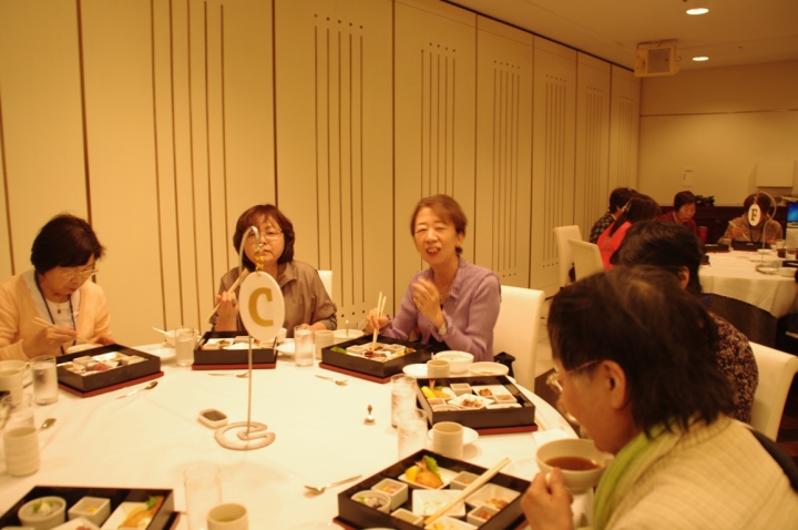 結婚式のような円卓で、洋食弁当をいただきます。お味はいかがでしたか。