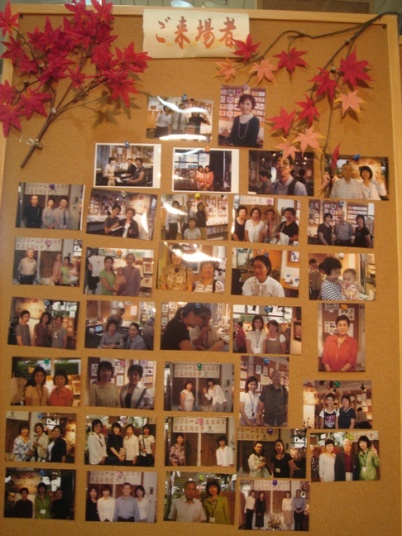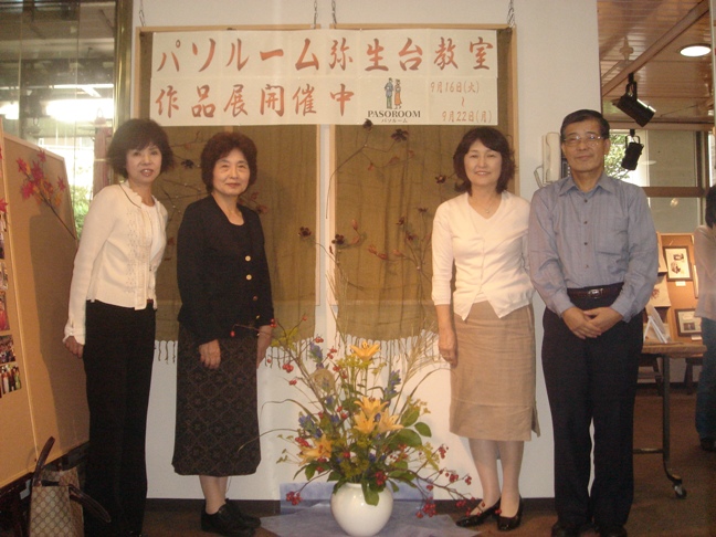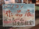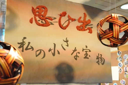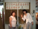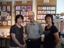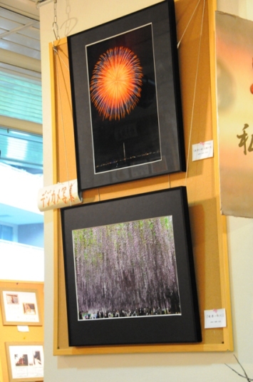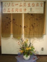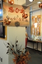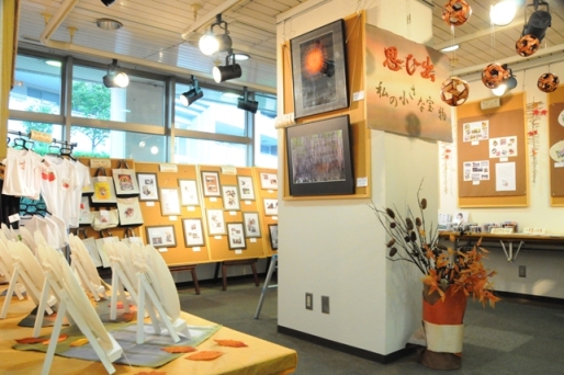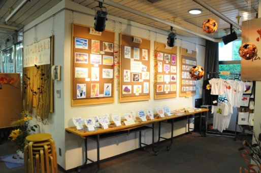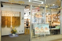 ガラス張りの明るいギャラリー。入口には夕陽をイメージしたポスターと