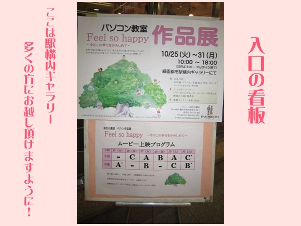 2011年10月25日(火)〜10月31(月) 緑園都市駅構内ギャラリーにて 今年もまた、例年通り作品展を開催することができました。 「例年通り」 今回ほどこの言葉をありがたく思ったことはありません。 大きな災害に見舞われた日本。 しかし、横浜に住む私達は「いつもの通り」毎日を平和に過ごさせてもらっています。 当たり前のようなこの毎日が、どれほど幸せか・・ そのことに感謝したい・・ そんな気持ちを込めて作り上げた今回の作品展でした。 その思いが綴られた水彩クラス13名の方の合作シンボルツリー。 皆さんのお気持ちが一杯詰まったムービー作品。 普段のレッスンの成果として出来上がったそれぞれの作品。 どれもこれもが今まで以上にありがたく思えます。 いろいろな思いを抱えながらも作品作りにご協力くださった皆さん、 そしてお忙しい中ギャラリーに足を運んで下さった287名の皆さま、 本当にありがとうございました。