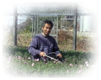 | 石井さんのお話、まずは土作りのコツを伺いました。 鉢植え用の用土は通気・保水・排水性が潅水により破壊されにくく、しかも保肥性の高いものがいい。栽培期間が長引くと根が過剰になり、根詰まりを起こしやすい。そこで、古くなった土は荒い目のざるで篩い、塵を除く。最後は1mmぐらいの目のざるで篩い、残った土を使うのがコツ。篩われた細かい土は目を詰まらせるので水はけが悪くなるし、根が張れないから捨てるとのこと。 |
